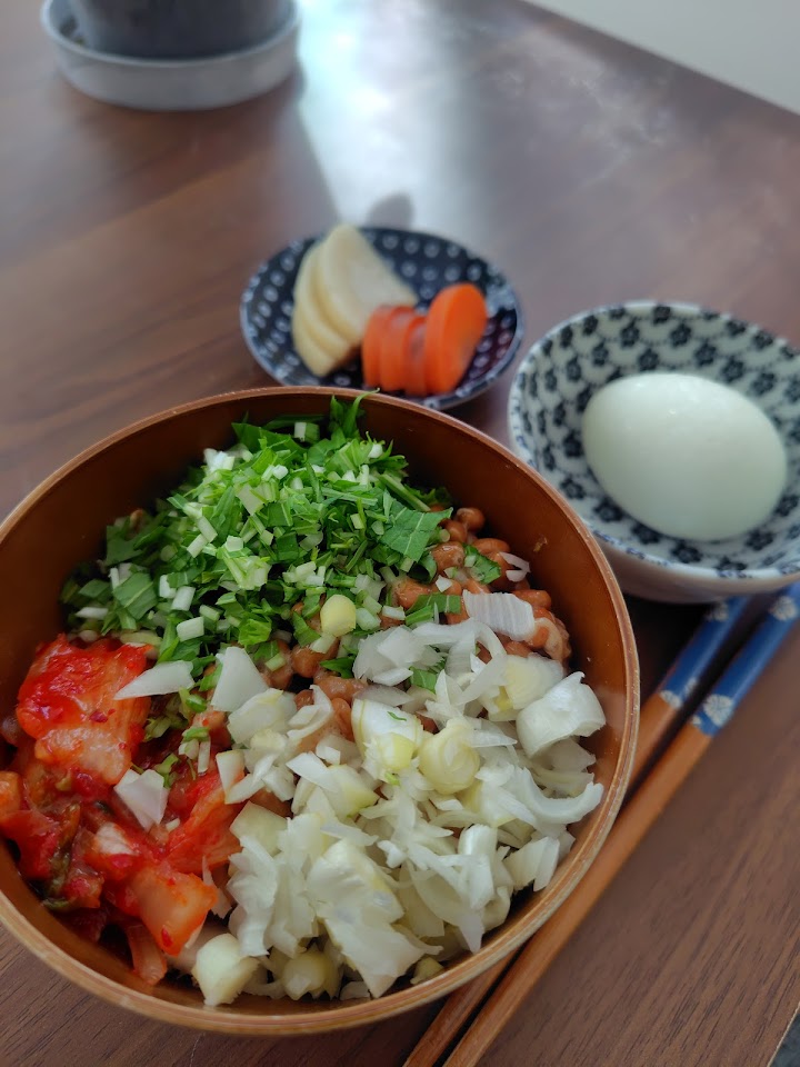 - オートミール+納豆+キムチ+ネギ+水菜・・・230 kcal