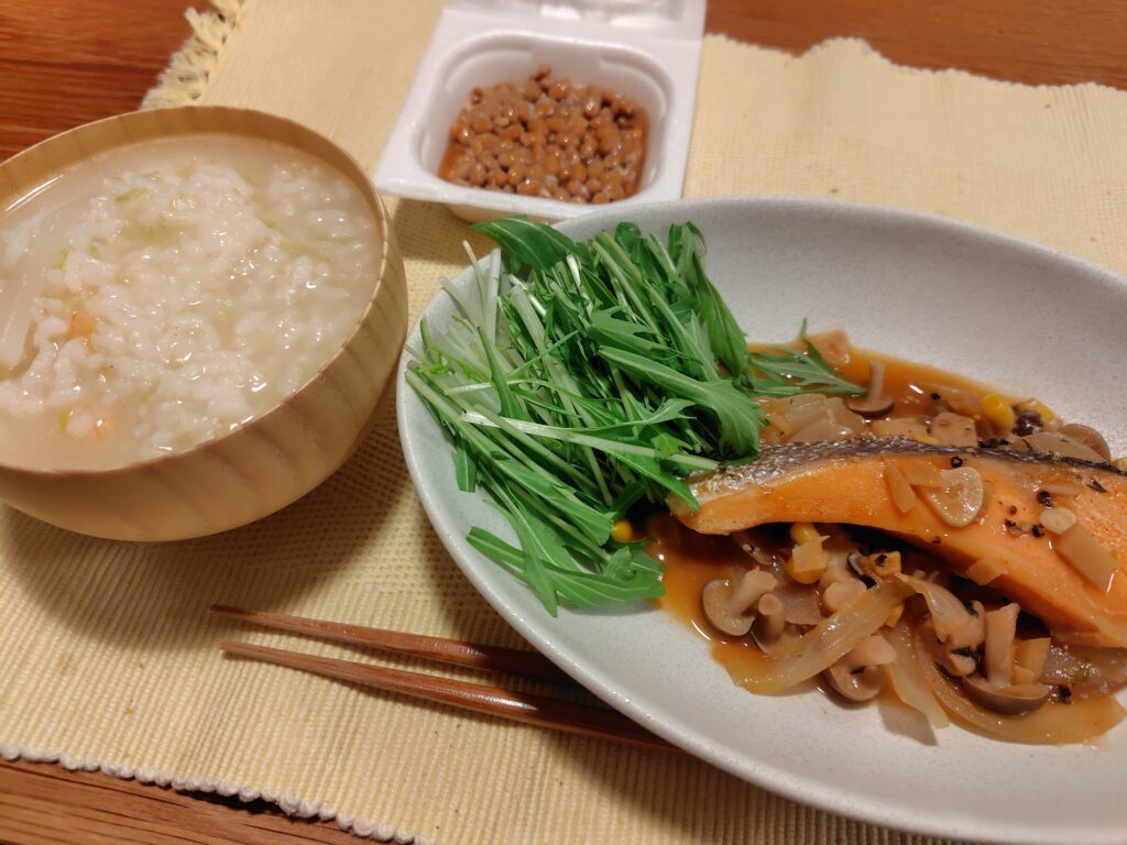 今日の朝昼晩の献立をご紹介します。ヨーグルトをギリシャヨーグルトにすることでタンパク質を多めにできます。鮭や納豆もタンパク質が豊富です。ご飯は雑炊にすることでかさましされるので、満腹感を得ながらカロリーをおさえることができます。