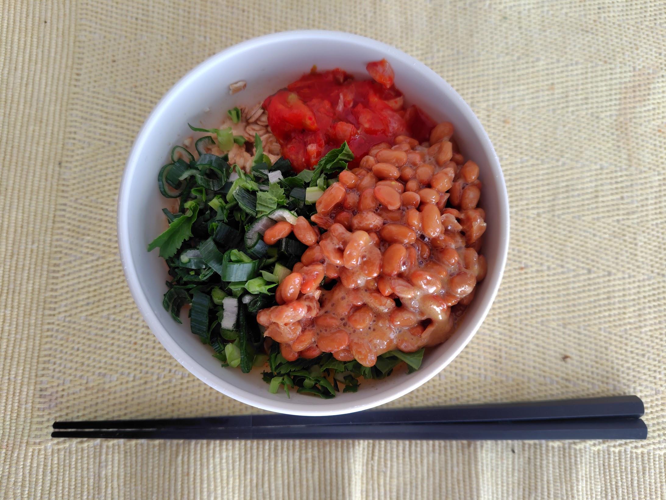 - オートミール+納豆+キムチ+ネギ+大根の葉・・・230 kcal
