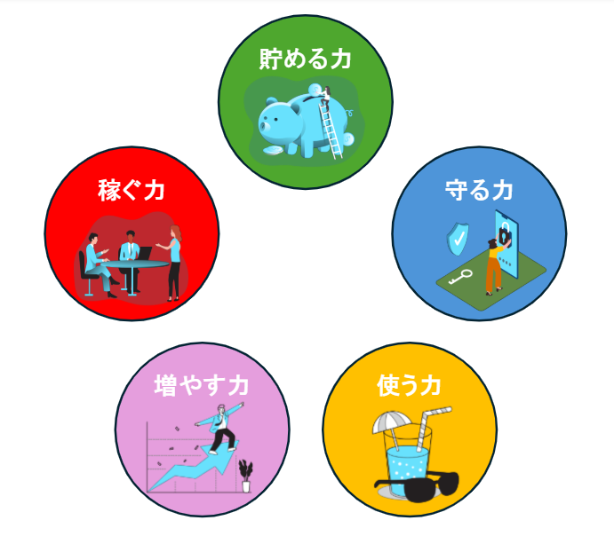- 資産を増やすためには”5つの力”を鍛える必要があります。5つの力とは、稼ぐ力、貯める力、増やす力、守る力、使う力のことを言います。