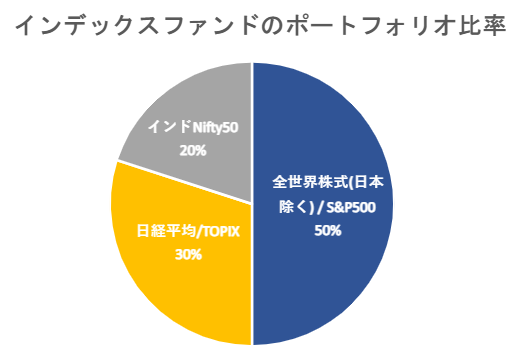 インデックスファンドを毎月30万円自動積立しFIREするまでBUY&HOLDする。ポートフォリオ比率は、全世界/米国50%、日本30%、インド20%を目指す。年末に、実際のポートフォリオ比率に応じて翌年の積立配分比率を決定する。