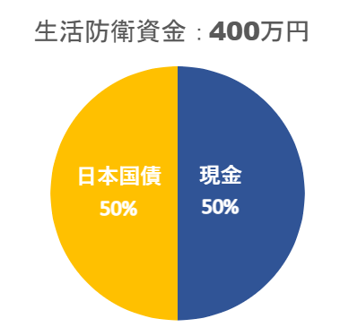 生活防衛資金は400万円。半分(200万円)は現金預金、もう半分(200万円)は日本国債で保有する。